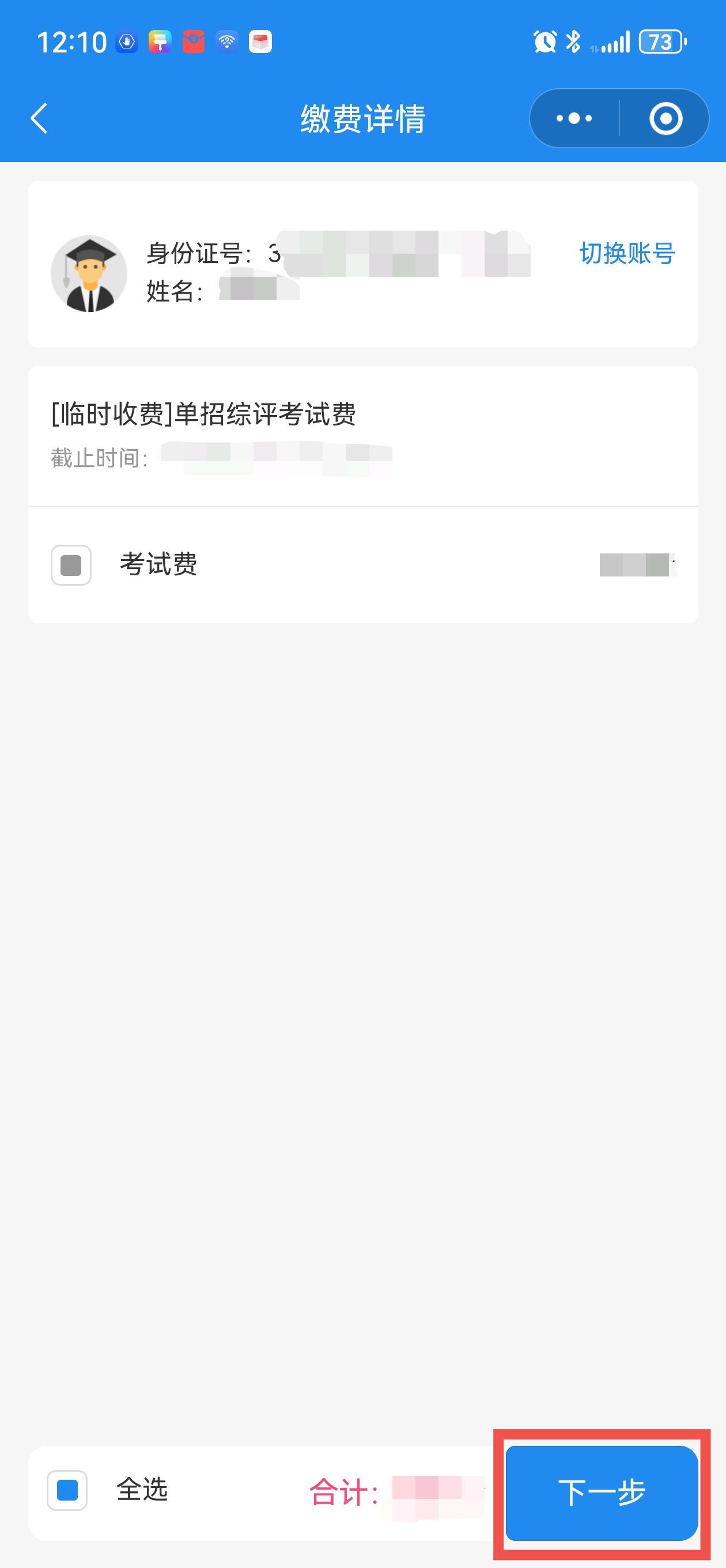 4. 按照以下示例输入考生信息,进入微信支付界面。(选择“其他缴费”→“单招综评考试费”→选择“考试费”后点击“下一步”完成缴费)
