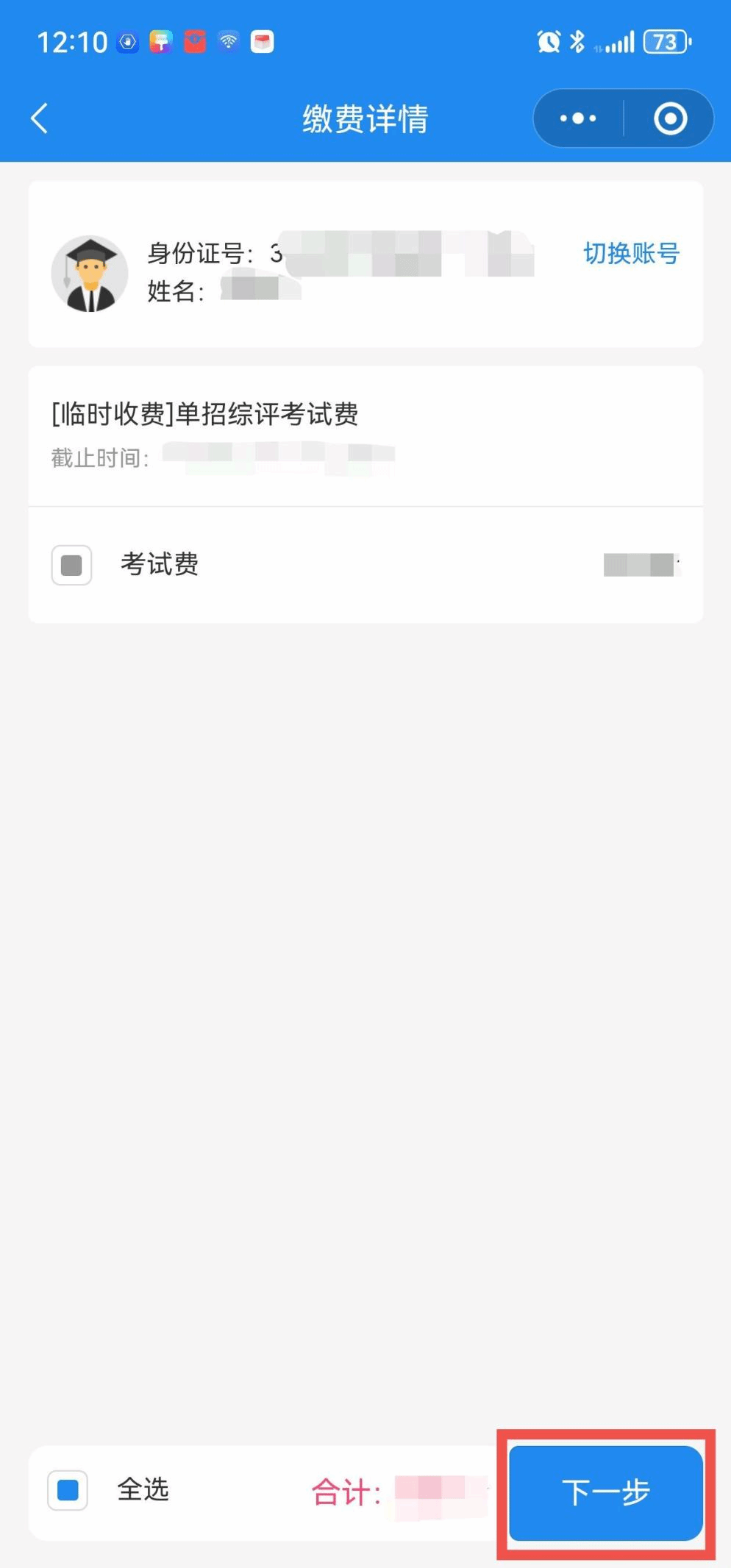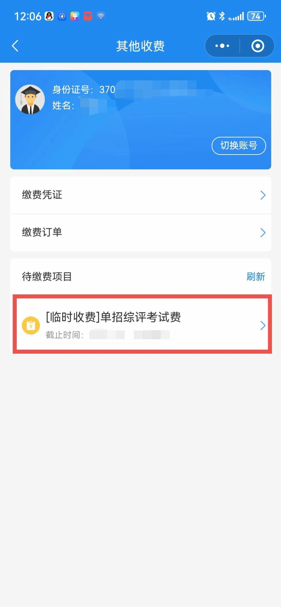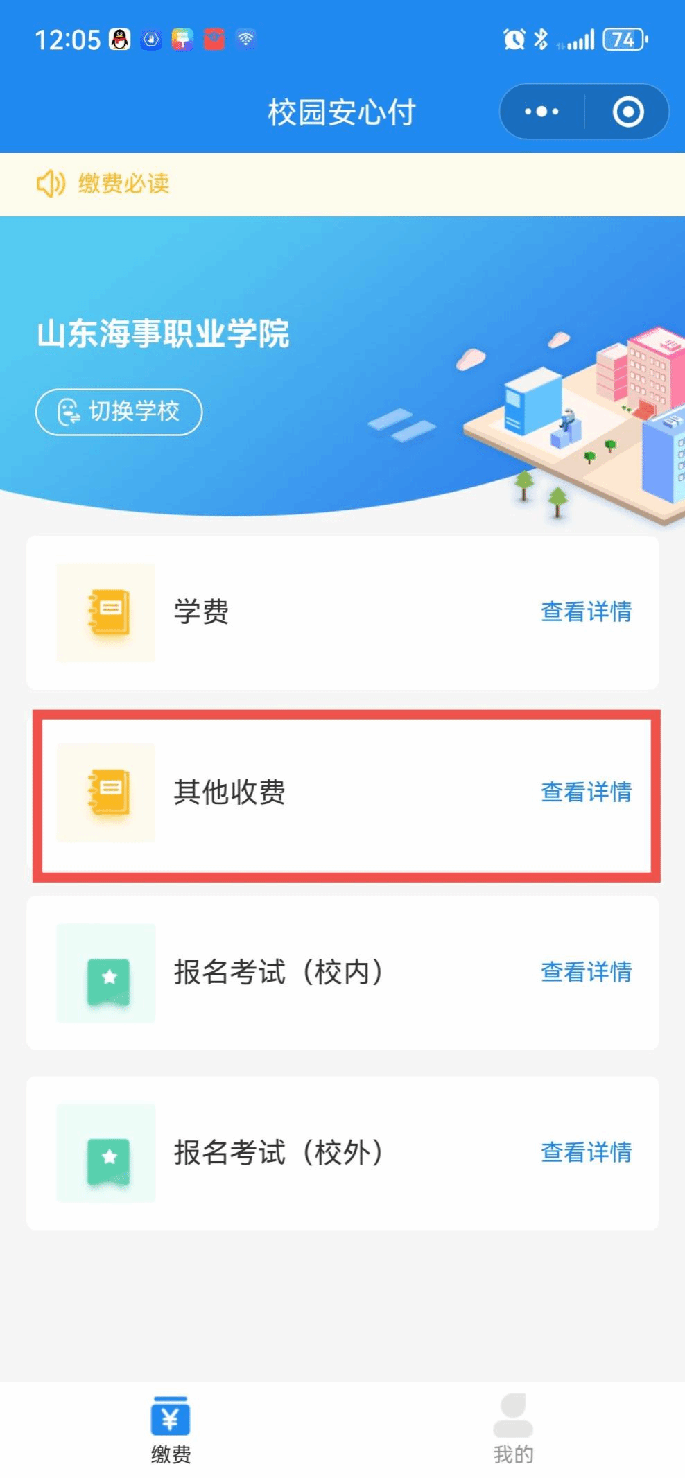 4. 进入校园安心付平台后按照以下示例输入考生信息,进入微信支付界面。(选择“其他收费”→“单招综评考试费”→选择“考试费”后点击“下一步”完成缴费)