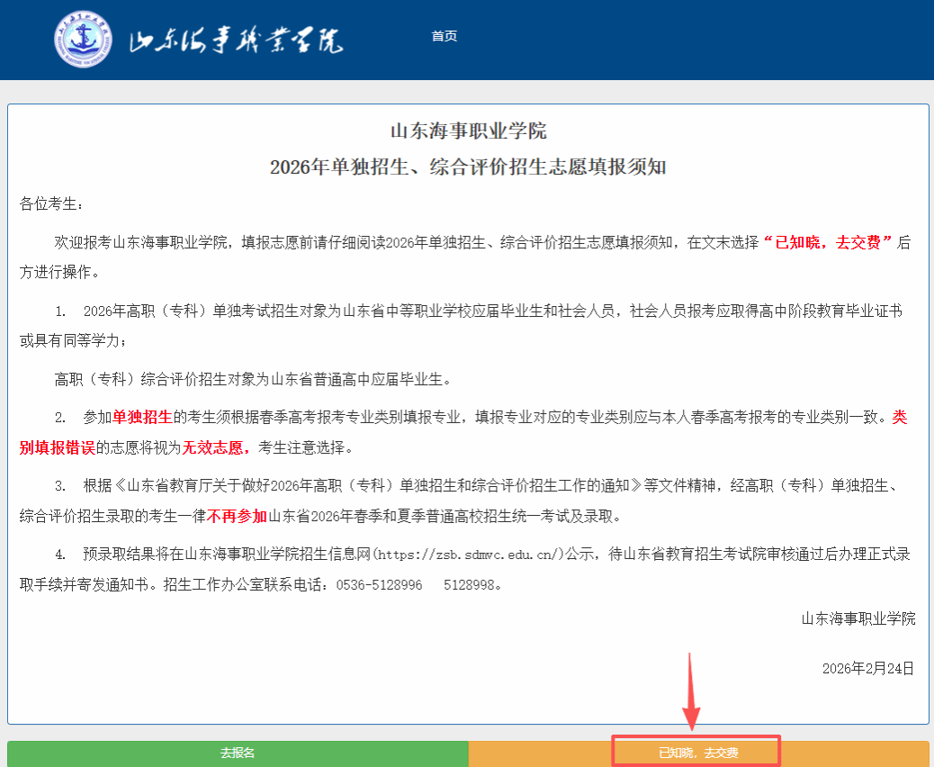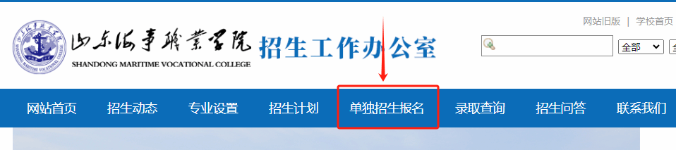 1. 手机/电脑浏览器搜索山东海事职业学院官网→“招生就业”专栏→“招生信息”→“单独招生报名”专栏→进入2026年单招综评考试系统,或直接点击网址(https://danzhao.sdmvc.edu.cn:8008/)登录山东海事职业学院2026年单招综评考试系统。